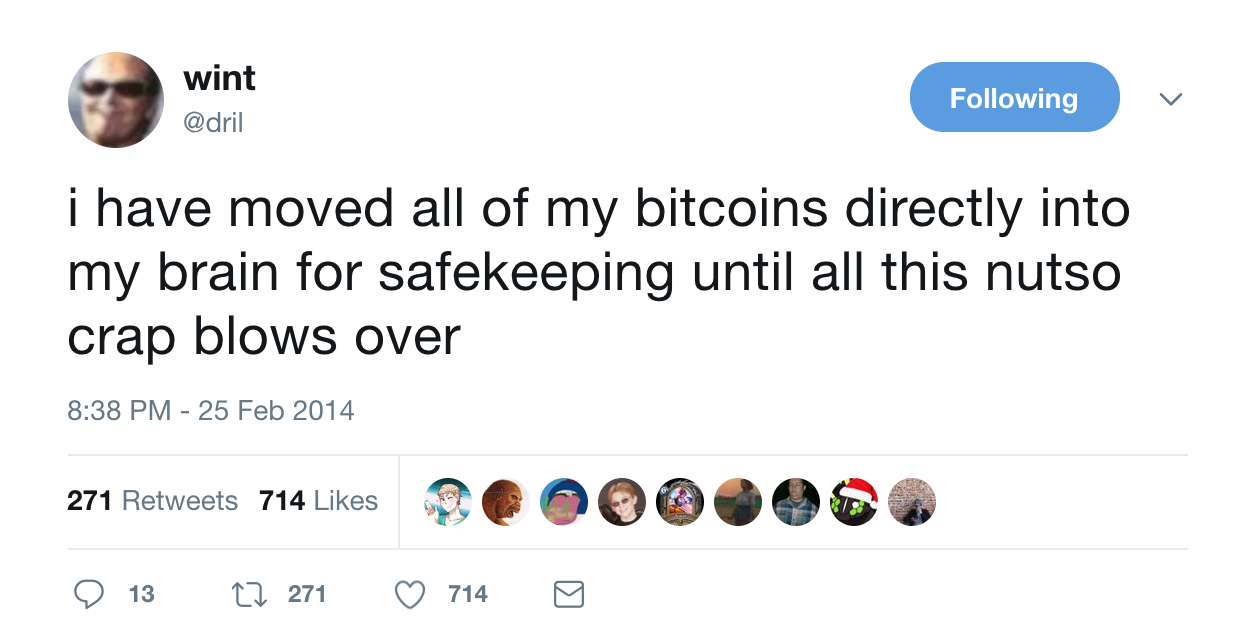 Just as with @dril’s humor, pseudonymity allowed individuals to impose their own meaning on Satoshi’s creation. Incredibly, almost a decade later, Satoshi has also remained masked.