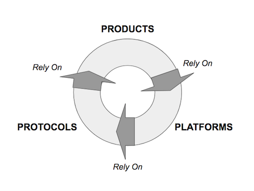 I noted that there are all kinds of dependencies among products, platforms, and protocols, resulting in every layer of the stack being built at once. Good products rely on secure, friendly platforms. Secure platforms depend on sound, scalable protocols. Protocols hinge upon an asset that, itself, serves as a product.