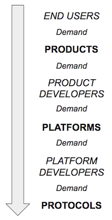Demand flows from the top-down. End users demand products. Products are built by developers. Developers demand platforms. Platforms are created by engineers. Engineers depend on protocols.