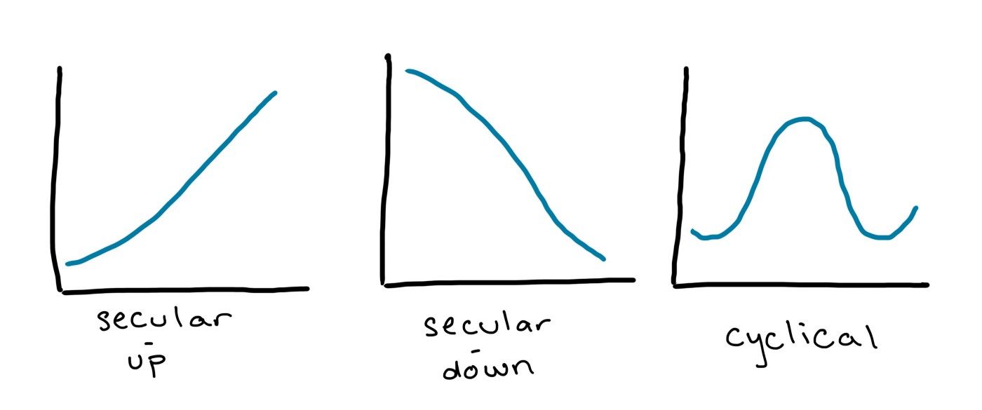 This whole narrative sounds pretty bleak but here’s the problem with it: this narrative assumes that these trajectories are secular in nature rather than cyclical. A secular trend is one that persists over the long term regardless of shorter term phenomena. The digitization (and monetization) of information that happened with the advent of the internet was a secular trend. A cyclical change, meanwhile, plays out over a shorter time frame and will not materially alter the longer term secular trend. The macroeconomy operates cyclically, going through periods of expansion and contraction usually lasting 5–10 years.